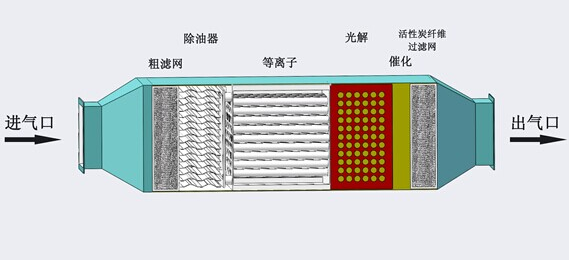 利用特制的高能高臭氧UV紫外線光束照射廢氣,裂解工業(yè)廢氣如:氨、三甲胺、硫化氫、甲硫氫、甲硫醇、甲硫醚、乙酸丁酯、乙酸乙酯、二甲二硫、二硫化碳和苯乙烯,硫化物H2S、VOC類,苯、甲苯、二甲苯的分子鏈結(jié)構(gòu),使有機(jī)或無機(jī)高分子惡臭化合物分子鏈,在高能紫外線光束照射下,降解轉(zhuǎn)變成低分子化合物,如CO2、H2O等。利用高能高臭氧UV紫外線光束分解空氣中的氧分子產(chǎn)生游離氧,即活性氧,因游離氧所攜正負(fù)電子不平衡所以需與氧分子結(jié)合,進(jìn)而產(chǎn)生臭氧。
