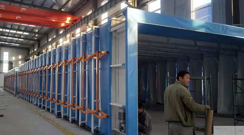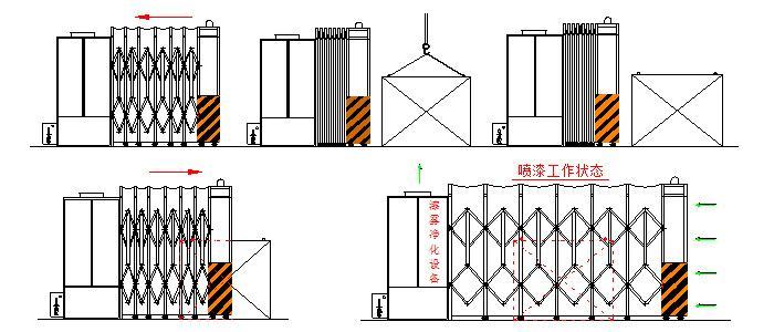 伸縮移動前室是本公司為解決重型工件移動難及工作區(qū)的綜合利用而專門設(shè)計的。一般固定式前室遇到將重型工件移入移出的工序,對于需要用天車搬運的工件就無法實現(xiàn)運輸,而移動前室可克服此弊端。工作噴漆前首先通過啟動控制按鈕將移動前室收縮合攏,讓出噴漆場地。待工件用天車安放就位后啟動控制按鈕將移動前室打開至“罩”住工件即可,而不用再移動工件,這用可以完全不影響天車的工作。移動前室由多組可保持平行移動的框架及連接框架的段接阻燃蓬布組成??蚣苤g的滑動連接機構(gòu)保證框架在驅(qū)動裝置的帶動下沿地面的軌道前后移動時保持豎直平行,同時帶動篷布展開合攏。